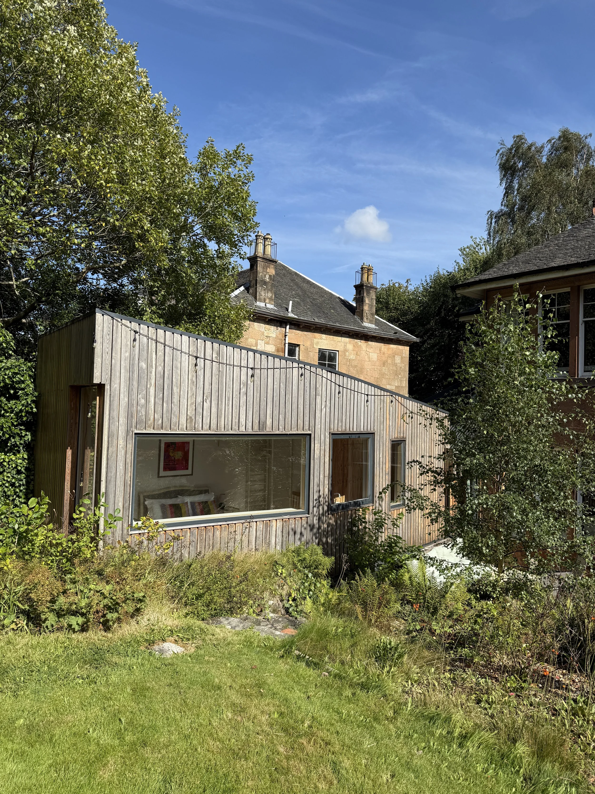 The extension was clad in locally sourced larch, which has since weathered into a soft silvery grey. Large bespoke windows were introduced, carefully positioned to frame long views across the garden and bring natural light deep into the space. Its gently sloping sedum roof offered a constantly changing display through the seasons and, in some small way, helped to replace the garden lost to the footprint of the new building. While its one drawback was that it could only really be appreciated from above, it allowed planting and biodiversity to remain part of the landscape rather than being entirely displaced.
