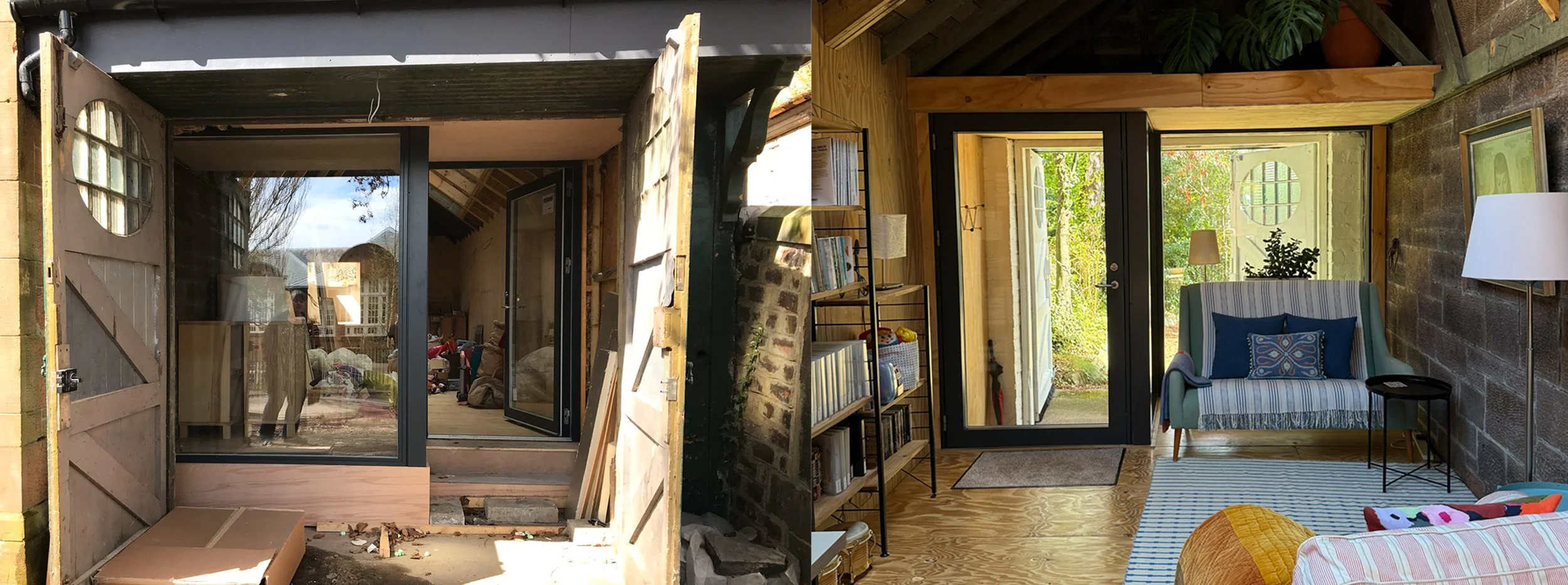 The converted garage was designed to feel as original as possible from the outside. The original doors were retained and repurposed as shutters, while behind them a bespoke glazed entrance now provides views out to the front garden — marrying practicality with the preservation of historic character.